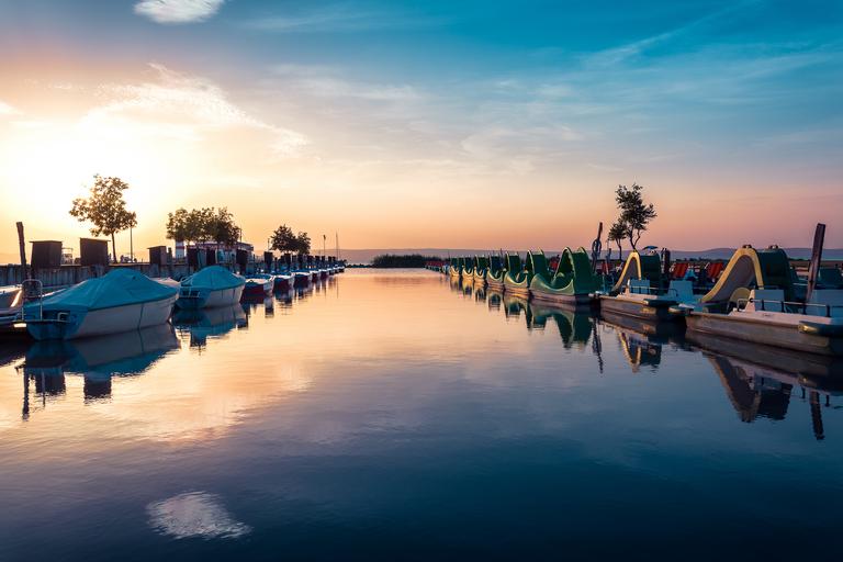 Keywords: sunset pedalo lake podersdorf summer holiday sunshine rest water hot lake neusiedl austria water surface reflection nature waterfront lakeside landscape panorama
