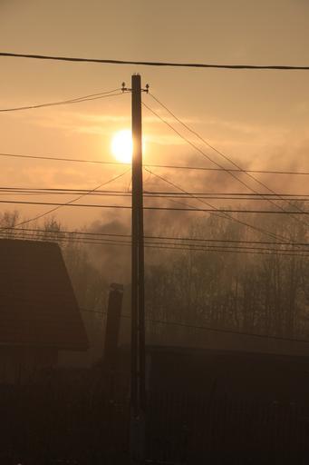 Keywords: sunset smoke chimney power lines mist winter