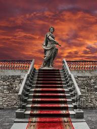 Keywords: sunset stairs staircase statue sculpture red purple gray stone formal sky ascend ascent climb step ambition boss achievement confident