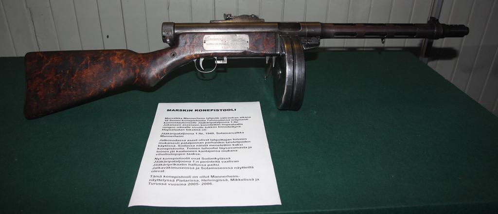 | Keywords: Suomi M31 Marskin konepistooli.JPG Carl Gustaf Emil Mannerheim donated 10 Suomi submachine guns fitted with silver plaques to jaeger battalion 1 Two of the guns were lost during Continuation War Photographed in Mikkeli infantry museum fi Suomi m/31 konepistooli yksi Marskin konepistooleista Marsalkka Mannerheim lahjoitti 10 Suomi-konepistoolia jääkäripataljoona 1 lle Jokaiseen aseeseen kiinnitettiin hopealaatta ja kaksi aseista menetettiin jatkosodassa Kuvattu Jalkaväkimuseossa own MKFI 2011-07-13 61 40 56 76 N 27 15 45 36 E region FI Suomi M31 Mikkeli Infantry museum Taken with Canon EOS 60D Taken with Canon EF-S 15-85mm F3 5-5 6 IS USM Files by User MKFI |