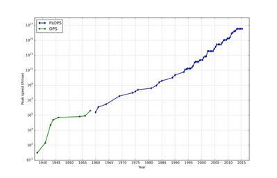 | Keywords: Supercomputing-rmax-graph2.svg en Plot of highest supercomputer performance over time own Morn 2014-05-11 History of computing Supercomputing diagrams Created with Matplotlib Images with Python source code Cc-zero Python source code <source lang python > /usr/bin/env python3 from pylab import use Matplotlib import datetime Data from HTML source at http //top500 org/statistics/perfdevel/ and https //en wikipedia org/w/index php title Supercomputer oldid 380073785 li 1938 1 1941 20 1943 5000 1944 25000 1946 50000 1954 67000 1956 83000 1958 400000 1960 250000 1961 1 2 1964 3 1969 36 1974 100 1975 150 1976 250 1981 400 1983 941 1984 2 4 1985 3 9 1989 10 3 1990 23 2 1993-05-01 59 7 0 42 1128 57 1993-10-01 124 0 47 1493 35 1994-05-01 143 4 0 84 2317 01 1994-10-01 170 1 16 2732 24 1995-05-01 170 1 96 3927 1995-10-01 170 2 49 4784 34 1996-05-01 220 4 3 31 5892 24 1996-10-01 368 2 4 62 7981 24 1997-05-01 1068 7 67 12844 19 1997-10-01 1338 9 51 16898 12 1998-05-01 1338 13 39 22625 14 1998-10-01 1338 17 12 29367 6 1999-05-01 2121 24 7 39062 57 1999-10-01 2379 33 09 50938 56 2000-05-01 2379 43 82 64230 11 2000-10-01 4938 55 3 88082 45 2001-05-01 7226 67 78 108276 78 2001-10-01 7226 94 3 134977 51 2002-05-01 35860 134 3 222263 77 2002-10-01 35860 195 8 291814 16 2003-05-01 35860 241 4 370049 26 2003-10-01 35860 378 6 526740 41 2004-05-01 35860 606 9 812313 21 2004-10-01 70720 840 02 1128834 52 2005-05-01 136800 1166 1694886 64 2005-10-01 280600 1645 7 2299341 68 2006-05-01 280600 2026 2789465 47 2006-10-01 280600 2736 9 3527867 61 2007-05-01 280600 4031 4950600 48 2007-10-01 478200 5937 33 6977593 51 2008-05-01 1026000 8996 78 12152691 08 2008-10-01 1105000 12593 5 17373520 05 2009-05-01 1105000 17110 22640789 57 2009-10-01 1759000 20070 28006450 09 2010-05-01 1759000 24670 32434684 56 2010-10-01 2566000 31124 36 43786881 73 2011-05-01 8162000 40187 29 58930025 84 2011-10-01 10510000 50941 4 74069633 68 2012-05-01 16324751 60824 4 123417786 71 2012-10-01 17590000 76411 162139386 75 2013-05-01 33862700 96619 223654338 13 2013-10-01 33862700 117831 30 250080467 17 2014-05-01 33862700 133700 273763781 09 2014-10-01 33862700 153381 308850512 09 2015-05-01 33862700 164790 72 362652490 36 x1 y1 x2 y2 for line in li splitlines if ' ' not in line continue e line split ' ' if '-' not in e0 m d 1 1 y int e0 else y m d int w for w in e0 split '-' f float e1 if y > 1983 mult 1e9 elif y > 1960 mult 1e6 else mult 1 if y < 1960 y2 append mult f x2 append datetime date y m d else y1 append mult f x1 append datetime date y m d figure figsize 14 9 semilogy x1 y1 label FLOPS lw 2 color blue marker d semilogy x2 y2 label OPS lw 2 color green marker p legend loc upper left xlabel 'Year' ylabel 'Peak speed Rmax ' grid 'on' xticks datetime date y 1 1 for y in range 1935 2040 5 axis datetime date 1937 1 1 datetime date 2018 1 1 1 1e18 savefig Supercomputing-rmax-graph svg show </source> |