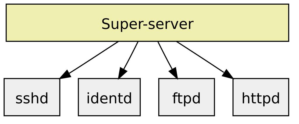 | Keywords: Superserver 2.svg  I am the author of this image I made it with Graphviz en wikipedia 2007-05-12 Frap wikipedia en Graphviz Source <pre> digraph G node shape box fillcolor efefef style filled fontname Verdana; Super-server fillcolor efefaf width 3 8; Super-server ->sshd Super-server ->identd Super-server ->ftpd Super-server ->httpd </pre> Frap Original upload log en wikipedia Superserver svg wikitable - 2007-05-12 14 53 290×120× 2875 bytes Frap Transparent background - 2007-05-12 14 52 290×120× 2962 bytes Frap fix - 2007-05-12 14 29 512×512× 3199 bytes Frap I am the author of this image I made it myself with Graphviz and a text editor - 2007-05-12 14 25 512×512× 3201 bytes Frap I am the author of this image I made it with Graphviz - 2007-05-12 14 19 355×145× 3232 bytes Frap I am the author of this image I made it with Graphviz Computer architecture diagrams |