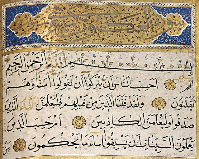 | Keywords: Surah 29al ankabut6inchx300dpi.jpg en Closeup of Surah al Ankabut from a beautiful handwritten Qur'an manuscript from Ottoman Empire 1400s-1800's found in region of Alanya Antalya Turkey On display in the Alanya Museum 1400s-1800's https //pixabay com/en/quran-islam-alanya-book-holy-font-586569/ Unknown calligrapher of Ottoman Empire other versions PD-Art Uploaded with UploadWizard Islamic calligraphy Qur'an Al Ankabut Archeological Museum Alanya Images from pixabay | ||||