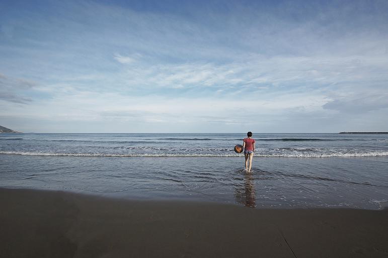 Keywords: surf wading woman ocean beach sea water shore waves standing female vacation holiday relaxing outdoors shadows clouds
