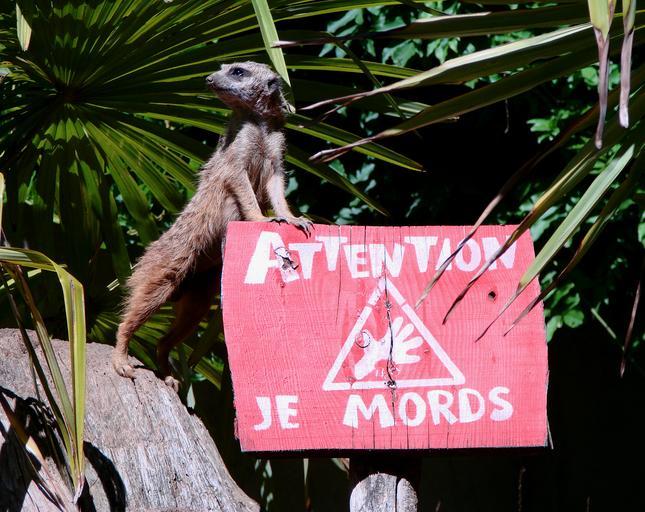 Keywords: Suricate 140801.jpg Suricate Suricata suricatta zoo d'Amnéville A suricate Suricata suricatta proudly standing upon the notice Take care I can bite Zoo d'Amnéville France Own 2007-08-16 Vassil Suricata suricatta in Amnéville Zoo Mammal-related warning signs |