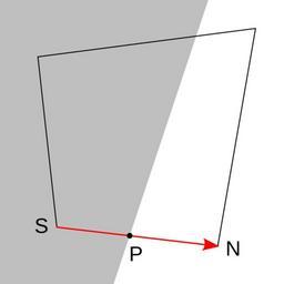 | Keywords: Sutherland-Hodgman caseB.svg Single step of internal loop of Sutherland-Hodgman clipping algorithm where certain edge of convex polygon denotes halfpace grayed area -- inside Single edge SN of non-convex polygon per iteration is analyzed in this case edge SN cross edge of convex polygon at point P -- algorithm saves this point Own 2008-03-02 Wojciech Muła public domain Sutherland-Hodgman algorithm | ||||
