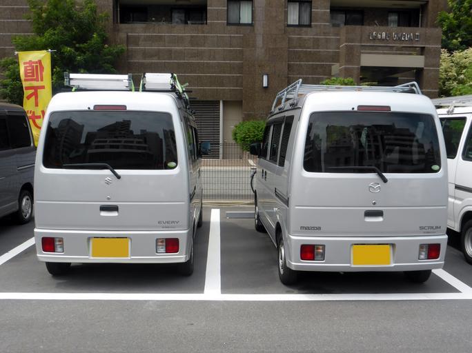 | Keywords: Suzuki EVERY (DA64) and Mazda SCRUM VAN (DG64) rear.JPG ja DA64型スズキ・エブリィをDG64型マツ ・スクラムバンを れぞれリアから撮影 2014-09-08 11 58 59 own Tokumeigakarinoaoshima 100px cc-zero Uploaded with UploadWizard Suzuki Every 5th generation Mazda Scrum fourth generation Grey vans |