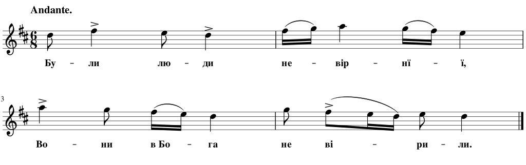| Keywords: Кант Юрию.svg uk Ілюст ація до статті иколи Лисенка а одні музичні ст ументи на Вк аїнї оти на одного Канта Ю ию 1894-04-27 Зо я часопис 1894 08 с 185-187 а одні; записано иколою Лисенком other versions Часопис Зо я 1894 08 pdf Hidden background ECECEC; white;color black border 1px grey solid; padding 2px Created by MuseScore <nowiki> < xml version 1 0 encoding UTF-8 > <museScore version 2 06 > <programVersion>2 0 2</programVersion> <programRevision>f51dc11</programRevision> <Score> <LayerTag id 0 tag default ></LayerTag> <currentLayer>0</currentLayer> <Synthesizer> </Synthesizer> <Division>480</Division> <Style> <lastSystemFillLimit>0</lastSystemFillLimit> <TextStyle> <halign>center</halign> <valign>baseline</valign> <xoffset>0</xoffset> <yoffset>6</yoffset> <offsetType>spatium</offsetType> <name>Lyrics Odd Lines</name> <family>FreeSerif</family> <size>11</size> <bold>1</bold> <sizeIsSpatiumDependent>1</sizeIsSpatiumDependent> </TextStyle> <page-layout> <page-height>374 173</page-height> <page-width>1190 55</page-width> <page-margins type even > <left-margin>5 66929</left-margin> <right-margin>5 66929</right-margin> <top-margin>56 6929</top-margin> <bottom-margin>113 386</bottom-margin> </page-margins> <page-margins type odd > <left-margin>5 66929</left-margin> <right-margin>5 66929</right-margin> <top-margin>0</top-margin> <bottom-margin>0</bottom-margin> </page-margins> </page-layout> <Spatium>1 764</Spatium> </Style> <showInvisible>1</showInvisible> <showUnprintable>1</showUnprintable> <showFrames>1</showFrames> <showMargins>0</showMargins> <metaTag name arranger ></metaTag> <metaTag name composer ></metaTag> <metaTag name copyright ></metaTag> <metaTag name creationDate >2015-11-28</metaTag> <metaTag name lyricist ></metaTag> <metaTag name movementNumber ></metaTag> <metaTag name movementTitle ></metaTag> <metaTag name platform >Microsoft Windows</metaTag> <metaTag name poet ></metaTag> <metaTag name source ></metaTag> <metaTag name translator ></metaTag> <metaTag name workNumber ></metaTag> <metaTag name workTitle ></metaTag> <PageList> <Page> <System> </System> <System> </System> </Page> </PageList> <Part> <Staff id 1 > <StaffType group pitched > <name>stdNormal</name> </StaffType> </Staff> <trackName>Violin</trackName> <Instrument> <longName>Violin</longName> <shortName>Vln </shortName> <trackName>Violin</trackName> <minPitchP>55</minPitchP> <maxPitchP>103</maxPitchP> <minPitchA>55</minPitchA> <maxPitchA>88</maxPitchA> <instrumentId>strings violin</instrumentId> <Articulation> <velocity>100</velocity> <gateTime>100</gateTime> </Articulation> <Articulation name staccatissimo > <velocity>100</velocity> <gateTime>33</gateTime> </Articulation> <Articulation name staccato > <velocity>100</velocity> <gateTime>50</gateTime> </Articulation> <Articulation name portato > <velocity>100</velocity> <gateTime>67</gateTime> </Articulation> <Articulation name tenuto > <velocity>100</velocity> <gateTime>100</gateTime> </Articulation> <Articulation name marcato > <velocity>120</velocity> <gateTime>67</gateTime> </Articulation> <Articulation name sforzato > <velocity>120</velocity> <gateTime>100</gateTime> </Articulation> <Channel> <program value 40 /> <synti>Fluid</synti> </Channel> <Channel name pizzicato > <program value 45 /> <synti>Fluid</synti> </Channel> <Channel name tremolo > <program value 44 /> <synti>Fluid</synti> </Channel> </Instrument> </Part> <Staff id 1 > <Measure number 1 > <KeySig> <accidental>2</accidental> </KeySig> <TimeSig> <sigN>6</sigN> <sigD>8</sigD> <showCourtesySig>1</showCourtesySig> </TimeSig> <Tempo> <tempo>1 16667</tempo> <text>Andante </text> </Tempo> <Chord> <durationType>eighth</durationType> <Lyrics> <syllabic>begin</syllabic> <text>Бу</text> </Lyrics> <Note> <pitch>74</pitch> <tpc>16</tpc> </Note> </Chord> <Chord> <durationType>quarter</durationType> <Articulation> <subtype>sforzato</subtype> </Articulation> <Lyrics> <syllabic>end</syllabic> <text>ли</text> </Lyrics> <Note> <pitch>78</pitch> <tpc>20</tpc> </Note> </Chord> <Chord> <durationType>eighth</durationType> <Lyrics> <syllabic>begin</syllabic> <text>лю</text> </Lyrics> <Note> <pitch>76</pitch> <tpc>18</tpc> </Note> </Chord> <Chord> <durationType>quarter</durationType> <Articulation> <subtype>sforzato</subtype> </Articulation> <Lyrics> <syllabic>end</syllabic> <text>ди</text> </Lyrics> <Note> <pitch>74</pitch> <tpc>16</tpc> </Note> </Chord> </Measure> <Measure number 2 > <LayoutBreak> <subtype>line</subtype> </LayoutBreak> <Slur id 2 > <track>0</track> </Slur> <Chord> <durationType>16th</durationType> <Lyrics> <syllabic>begin</syllabic> <text>не</text> </Lyrics> <Slur type start id 2 /> <Note> <pitch>78</pitch> <tpc>20</tpc> </Note> </Chord> <Chord> <durationType>16th</durationType> <Slur type stop id 2 /> <Note> <pitch>79</pitch> <tpc>15</tpc> </Note> </Chord> <Chord> <durationType>quarter</durationType> <Lyrics> <syllabic>middle</syllabic> <text>ві </text> </Lyrics> <Note> <pitch>81</pitch> <tpc>17</tpc> </Note> </Chord> <Slur id 3 > <track>0</track> </Slur> <Chord> <durationType>16th</durationType> <Lyrics> <syllabic>middle</syllabic> <text>нї</text> </Lyrics> <Slur type start id 3 /> <Note> <pitch>79</pitch> <tpc>15</tpc> </Note> </Chord> <Chord> <durationType>16th</durationType> <Slur type stop id 3 /> <Note> <pitch>78</pitch> <tpc>20</tpc> </Note> </Chord> <Chord> <durationType>quarter</durationType> <Lyrics> <syllabic>end</syllabic> <text>ї </text> </Lyrics> <Note> <pitch>76</pitch> <tpc>18</tpc> </Note> </Chord> </Measure> <Measure number 3 > <Chord> <durationType>quarter</durationType> <Articulation> <subtype>sforzato</subtype> </Articulation> <Lyrics> <syllabic>begin</syllabic> <text>Во</text> </Lyrics> <Note> <pitch>81</pitch> <tpc>17</tpc> </Note> </Chord> <Chord> <durationType>eighth</durationType> <Lyrics> <syllabic>end</syllabic> <te