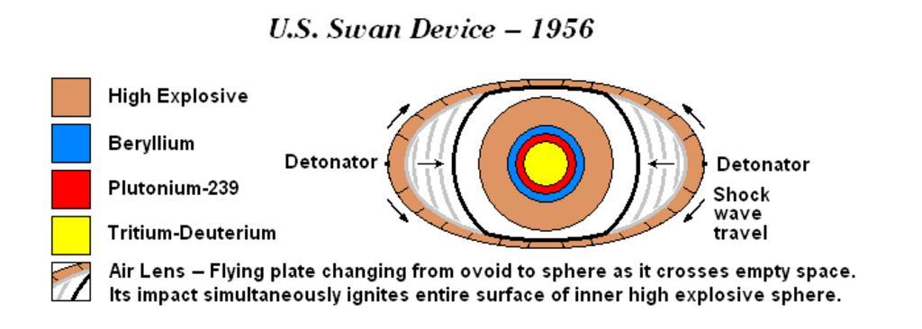 Keywords: Swan Boosted Fission.png Schematic drawing of the basic elements of the fusion-boosted Swan nuclear device Originally uploaded as a gif image Own 2007-11-11 Boosting U S _Swan_Device svg Nuclear weapon schemas Swan nuclear explosive