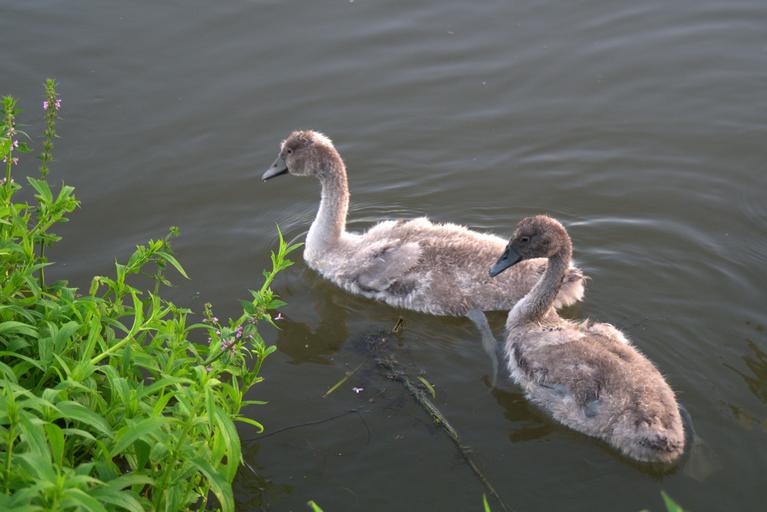 Keywords: swans swan young swans gray white young wild birds nature water birds water bird chicks relief channel evening reflection animal river
