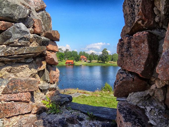 Keywords: sweden lake water reflections sky clouds stones entrance ruins view grass houses architecture hdr summer spring country countryside trees