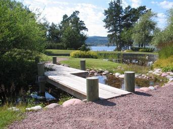 Keywords: sweden leksand garden water bridges sky blue tree summer gravel