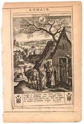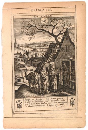 Keywords: Sweelink December.jpg en December St Joseph and the pregnant Virgin standing outside a village-house in foreground a village and river in background; zodiacal sign of Capricorn at top centre; letterpress in black and red ink above impression and on verso Plate 12 in a series of engravings The Twelve Months showing the months with scenes from the New Testament and French text underneath Height 137 millimetres<br> Width 90 millimetres 1624-45 http //kharoozo livejournal com/2726655 html Live Journal Creator Jan Gerritsz Sweelink PD-old-100 Jan Gerritsz Sweelink Uploaded with UploadWizard Mary and Joseph seeking refuge December |