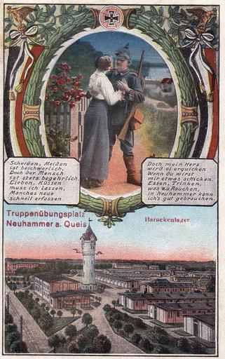 | Keywords: Świętoszów.jpg en Świętoszów German Neuhammer am Queis Lithographic postcard sent June 22 1918 from Kłodzko German Glatz The postcard shows the military training ground founded in 1898 a water tower from the early 20th century and patriotic image - Prussian soldier Publisher H L B pl Świętoszów niem Neuhammer am Queis Pocztówka litograficzna wysłana 22 czerwca 1918 roku z Kłodzka niem Glatz Widoczne zaplecze poligonu wojskowego kwatery w barakach założonego w 1898 roku w czasie I wojny światowej w Świętoszowie utworzono obóz jeniecki; wieża ciśnień z początku XX wieku zachowana do czasów współczesnych;w górnej części pocztówki symboliczny obrazek o tematyce patriotycznej- żołnierz pruski Wydawca H L B de Neuhammer am Queis Świętoszów Lithographischen postkarte abgestempelt am 22 Juni 1918 in Glatz Kłodzko Die postkarte zeigt den Truppenübungsplatz 1898 gegründet ;ein Wasserturm aus dem frühen 20 Jahrhundert und patriotische Bild- preußischer Soldat Verlag H L B Own collection / Kolekcja własna D N Publisher / Wydawca H L B 1918 Świętoszów PD-old-100 |