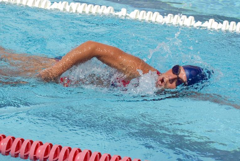 Keywords: swimmer training water pool goggles cap fitness female race active adult freestyle stroke