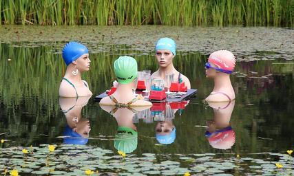 Keywords: swimmers women talk gambling group swim swim cap four compared to mirroring reflect mermaids bathing mermaids waters water pond lake art art object modern dolls mannequins communication friendship exchange human interaction chat communicate converse tray table graceful artwork art project botanical garden ulm installation people