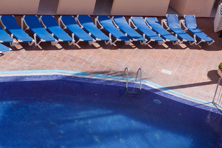 Keywords: swimming pool sun loungers rest recovery relax flow water overflow shadow palm blue turquoise