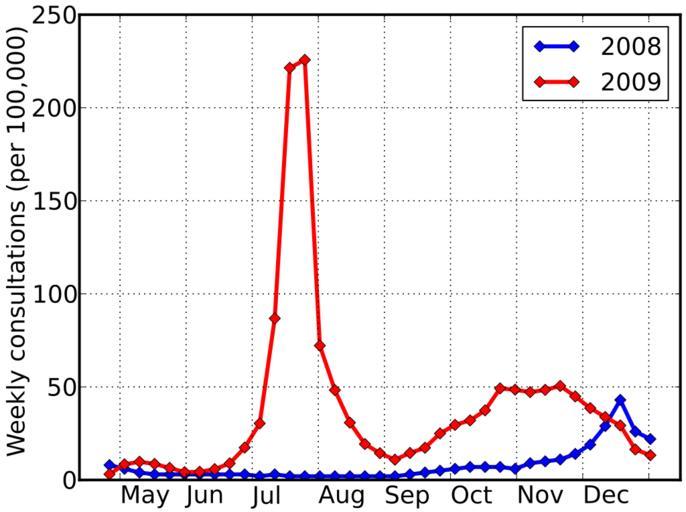 | Keywords: Swineflu uk rate.svg en Weekly consultation rate for influenza-like illness in the UK Graph is own work by uploader numerical data from documents at HPA which sourced data from QResearch Dave Farrance 2010-01-15 Source Figures for 2009 flu sourced from documents at HPA Weekly epidemiological updates archive http //www hpa org uk/webw/HPAweb HPAwebStandard/HPAweb_C/1244442494458 and figures for 2008 flu estimated from inspection of Fig 2 at web-page for HPA's Weekly pandemic flu update for 16th July 2009 http //www hpa org uk/web/HPAweb HPAwebStandard/HPAweb_C/1247728933406 This graph was created with the following Python/Matplotlib script <source lang python > /usr/bin/env python from pylab import flu08 8 6 4 3 3 3 3 3 3 3 2 3 2 2 2 2 2 2 2 2 3 4 5 6 7 7 7 6 9 10 11 14 19 29 43 26 22 flu09 3 1 8 4 9 8 8 6 6 5 4 2 4 4 5 8 8 9 17 4 30 4 86 8 221 4 225 7 72 2 48 3 30 8 19 3 14 4 10 9 14 5 17 3 25 0 29 6 32 0 37 4 49 2 48 5 47 2 48 4 50 5 44 9 38 6 33 8 29 3 16 4 13 3 rc 'axes' lw 2 0 plot range 17 17+len flu08 flu08 'bD-' lw 3 0 label '2008' plot range 17 17+len flu09 flu09 'rD-' lw 3 0 label '2009' xticks array range 0 9 4 4+17 7 'May' 'Jun' 'Jul' 'Aug' 'Sep' 'Oct' 'Nov' 'Dec' size 18 ha 'left' yticks size 18 grid lw 0 75 ylabel 'Weekly consultations per 100 000 ' size 18 rc 'legend' fontsize 18 ; legend savefig 'sf-qs svg' </source> I release the graph and its source script to the public domain -- but note that the numerical data that was used to create this graph was sourced from press release documents on the HPA website which sourced data from QResearch but I could find no statement of rights to that numerical data either in the documents or on the website Influenza Epidemics 2009 swine flu outbreak in the United Kingdom 2009 swine flu outbreak graphs Pandemic |