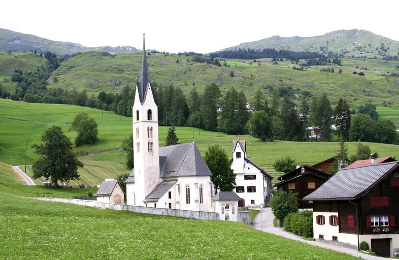 Keywords: switzerland landscape mountains church village buildings architecture forest trees hills grass valley summer nature outside country countryside peaceful tranquil beautiful