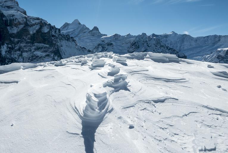 Keywords: switzerland mountains winter snow grindelwald landscape alpine schreckhorn swiss alps nature drifting snow structures shadow mountain landscape mountain summit deep foreground nice weather blue snow mountains