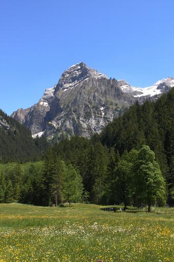 Keywords: switzerland steering ammertenhorn mountains nature landscape meadow trees sky blue hiking