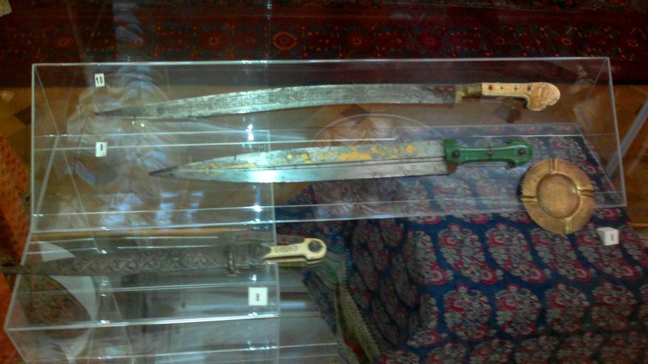 Keywords: Sword, daggers, ashtray and tablecloth pertaining to Karabakh khanate 2.jpg en Sword daggers ashtray and tablecloth tirme belonged to Karabakh khan Museum of History of Azerbaijan Baku own work Interfase 2013-05-17 40 22 8 0547 N 49 50 24 4969 E alt 0_source exif_heading Yatagans Kindjal Metal ashtrays Tablecloths Khanate of Karabakh Department of the Khanate Period Museum of History of Azerbaijan Asian Azeri Abjab script |