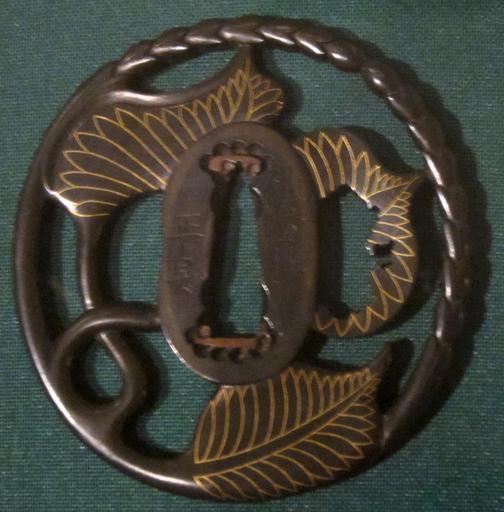 | Keywords: Sword guard (tsuba) with hollyhock leaves and stems signed Masasada.JPG Sword guard tsuba with hollyhock leaves and stems signed Masasada early-19th century Japan shakudō and gold own photo2013 Haa900 Tsuba made with shakudō Alcea rosea in art Cc-zero |