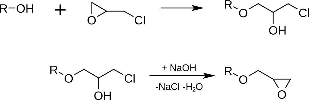| Keywords: Synthesis epoxide Epichlorohydrin.svg en At first the hydroxyl group reacts in a coupling reaction with epichlorohydrin followed by dehydrohalogenation de Zuerst reagiert die Hydroxylgruppe in einer Kupplungsreaktion mit Epichlorhydrin gefolgt von einer Dehydrohalogenierung 2014-11-09 20 00 44 own Minihaa other versions cc-zero Uploaded with UploadWizard Epoxides |