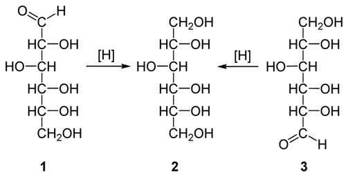 Keywords: Synthesis of sorbitol.svg en synthesis of D-sorbitol 2 reducing D-glucose 1 or L-gulose 3 de Synthese von D-Sorbitol 2 durch das Reduzieren von D-Glucose 1 oder L-Gulose 3 own Yikrazuul 2009-10-26 Sorbitol Glucose Gulose Fischer projection