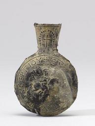 Keywords: Syrian - Pilgrim Flask of Saint Sergios - Walters 55105 - Side B.jpg This rare and beautifully preserved flask is one of the first to depict St Sergios on horseback surrounded by the inscription Blessing of the Lord of Saint Sergios The cult of this 3rd-century saint reached its height of popularity in the 6th century at the site of his martyrdom in Sergiopolis in northern Syria century 6 7 Late Antique tin-lead alloy cm 5 4 3 81 1 59 accession number 55 105 34878 Private collection Haddad date and mode of acquisition unknown Antiquarium Ltd Fine Ancient Art Gallery New York by purchase date of acquisition unknown Walters Art Museum 2000 by purchase Museum purchase with funds provided by the W Alton Jones Foundation Acquisition Fund 2000 Translation on both sides + Blessing of the Lord from the sanctuary of Saint Sergius Treasures of Heaven The Cleveland Museum of Art Cleveland; The Walters Art Museum Baltimore; The British Museum London 2010-2011 place of origin Rusafah Syria Walters Art Museum license Byzantine and Early Russian art in the Walters Art Museum Ceramics from Syria Media contributed by the Walters Art Museum needs category review |