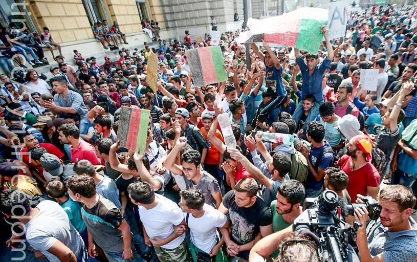 MAKE A MEME View Large Image Syrian and Afghan refugees shout slogans and hold placards during a protest rally to demand to travel to Germany on September 2, outside the Keleti (East) railway station in Budapest. Hungarian authorities face mounting anger from thousands ...