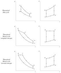 | Keywords: T-s and p-v diagrams for Otto and Diesel cycles.svg en Temperature-entropy and pressure-volume charts comparing the Otto cycle top the original Diesel cycle as first presented by Rudolf Diesel middle and the revised Diesel cycle bottom Typically the compression ratio in Diesel cycle is much higher than in Otto cycles 2014 own Olivier Cleynen other versions cc-zero SVG physics Uploaded with UploadWizard Temperature-entropy diagrams Pressure-volume diagrams Otto cycle Diesel cycle | ||||