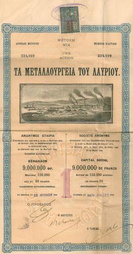 | Keywords: Ta Metallourgeia tou Lavriou 1909 share.jpg el ετοχή του 1909 της εταιρείας Τα εταλλουργεία του Λαυρίου en 1909 share of the company Ta metallourgeia tou Lavriou 2013-09-07 10 03 30 http //www fimarkets com/php/old-stock-images php image_rank 13 image_type stock lang en The company Ta metallourgeia tou Lavriou Custom license marker 2013 09 07 PD-old Uploaded with UploadWizard Laurium Stock certificates | ||||