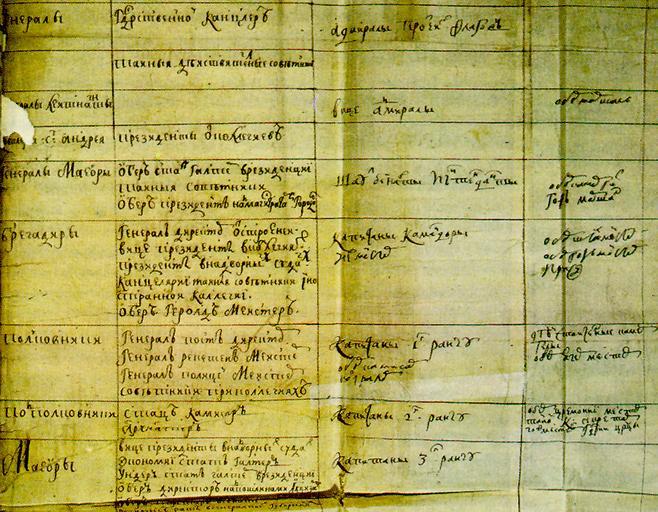 | Keywords: Tabel o rangah.jpg  ru Табель о  ангах всех чинов воинских статских и п идво ных кото ые в кото ом классе чины; и кото ые в одном классе те имеют по ста шинству в емени вступления в чин между собою однако ж воинские выше п отчих хотя б и ста ее кто в том классе пожалован был Table of Ranks Табель о  ангах Peter I of Russia 1722-01-24 PD-old-100 Military Literature of the Russian Empire |