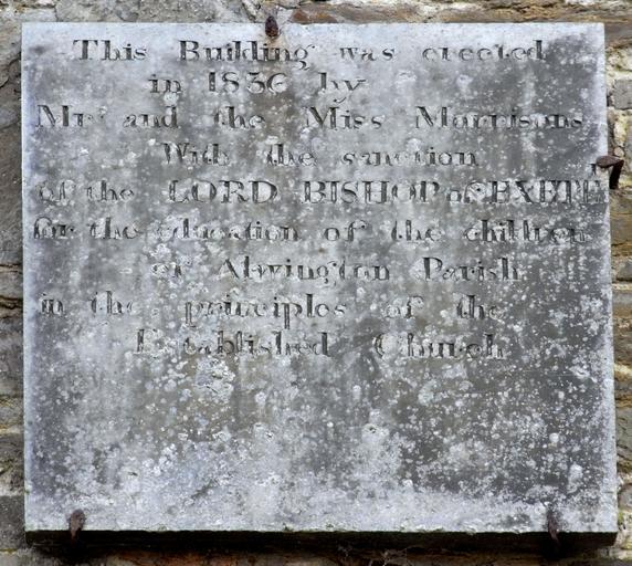 | Keywords: Tablet AlwingtonSchoolhouse Devon.jpg en Stone tablet Alwington Schoolhouse Alwington Devon Situated high on the east gable end of the building inscribed This building was erected in 1836 by Mr<sup>s</sup> and the Miss Morrisons with the sanction of the Lord Bishop of Exeter for the education of the children of Alwington parish in the principles of the Established Church Anna Rolle Wollocombe 1781-1860 Mrs Morrison was the widow of Rev Thomas Hooper Morrison 1768-1824 of Yeo Vale Alwington owner of Hartland Abbey a Fellow of New College Oxford and Rector of Alwington and Vicar of Launcells Cornwall He left three sisters as his co-heiresses Elizabeth Mrs Hammett Anne and Eleanor the Miss Morrisons own photo Lobsterthermidor <span class signature-talk ></span> 15 14 2 April 2015 UTC 2015 Alwington Schoolhouse Plaques in Devon |