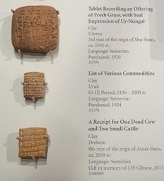 Keywords: Tablets in Sumerian language - (1) Umma, 3rd year of reign of Shu-Suen, c. 2035 BC, (2) Uruk, Ur III Period, 2100-2000 BC, (3) Drehem, c. 2039 BC - Oriental Institute Museum, University of Chicago - DSC07082.JPG en Exhibit in the Oriental Institute Museum University of Chicago Chicago Illinois USA This work is old enough so that it is in the public domain Photography was permitted in the museum without restriction 2014-08-22 14 33 18 own Daderot other versions cc-zero Sumerian inscriptions in the Oriental Institute Museum Uploaded with UploadWizard |
