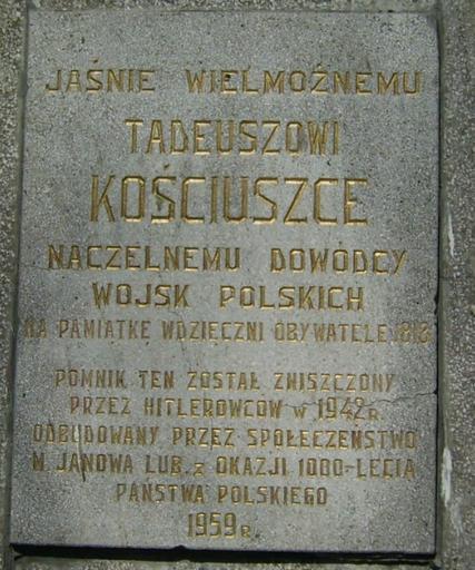 Keywords: Tablica na pomniku Tadeusza kościuszki w Janowie Lubelskim 2.jpg pl Tablica na pomniku Tadeusza Kościuszki w Janowie Lubelskim 2 own Ziomalitto Cc-zero Tadeusz Kościuszko Monument in Janów Lubelski