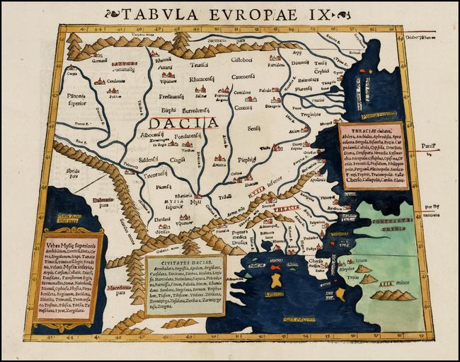 | Keywords: Tabula Europae IX.jpg en The Ninth European Map depicting the eastern Balkans from one of the editions of Sebastian Münster's Cosmographia an expansion of Ptolemy's Geography The map is unchanged from the 1540 plates Tabula Europae Nona ~ 1550 https //www raremaps com/gallery/detail/30310/Tabula_Europae_IX_Greece_and_Turkey/Munster html BL Ruderman Antique Maps Ptolemy other versions <gallery> Sebastian Munster - Tabula europae IX Dacia jpg </gallery> PD-old-70-1923 Cosmographia Münster Ptolemy's 9th European Map 1550 Maps in Latin 1550s maps 1540 maps Maps with cartouches |