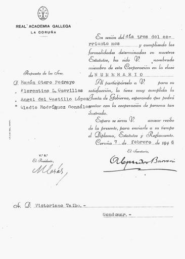 | Keywords: Taibo nombrado miembro de la Real Academia Gallega, Coruña, 7 de febrero de 1946.jpg Taibo nombrado miembro de la Real Academia Gallega Coruña http //armandorequeixo blogaliza org/2016/03/13/no-cincuentenario-de-victoriano-taibo/ Criticalia blog de Armando Requeixo 1946-02-07 RAG Pd-text PD-SpanishGov De minimis Real Academia Galega 1946 in Galicia Spain Victoriano Taibo Otero Pedrayo Florentino López Cuevillas Ángel del Castillo Eladio Rodríguez González Alejandro Barreiro Noya Manuel Casás Fernández A Coruña in the 1940s February 1946 Signatures of writers from Galicia Spain |