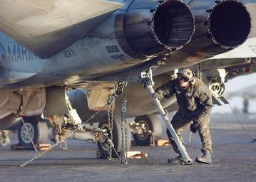 Keywords: Tail hook detail.jpg A Marine assigned to the Silver Eagles of Marine Strike Fighter Attack Squadron One One Five VMFA-115 conducts a preflight check on the tailhook on one of the squadron ™s F/A-18A+ Hornets 050124-N-4308O-018 Persian Gulf Jan 24 2005 - A Marine assigned to the Silver Eagles of Marine Strike Fighter Attack Squadron One One Five VMFA-115 conducts a preflight check on the tailhook on one of the squadron ™s F/A-18A+ Hornets prior to the start of flight operations on the flight deck of the Nimitz-class aircraft carrier USS Harry S Truman CVN 75 Carrier Air Wing Three CVW-3 is embarked aboard Harry S Truman and is providing close air support and conducting intelligence surveillance and reconnaissance missions over Iraq The Truman Carrier Strike Group and CVW-3 are on a regularly scheduled deployment in support of the Global War on Terrorism U S Navy photo by Photographer ™s Mate Airman Ryan O'Connor RELEASED Airplane Serial 163171 Code VE-210 Type F/A-18A CN 611/A517 Unit VMFA-115 source http //www scramble nl/usnbase htm Photographer ™s Mate Airman Ryan O'Connor RELEASED Original from http //www news navy mil/view_single asp id 21270 PD_USN Tail hooks aircraft F/A-18A Hornet Taken with Nikon D1X |