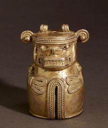 | Keywords: Tairona - Bell with Feline Diety - Walters 572288.jpg The earliest evidence of goldworking in the Western Hemisphere dates to around 2000 BC when gold was first hammered into thin foil sheets in ancient Peru But it was the goldsmiths of Colombia who had access to the largest veins of gold ore which they extracted by placer mining panning and by building simple vertical shaft mines Gold was melted and worked in a variety of techniques including hammering often around a wooden form and lost-wax casting in which a wax model of an object is made and encased in clay which is fired causing the wax to melt and run out through a hole; molten gold is then poured into the hole and hardens and the resulting figure is revealed when the clay mold is broken apart Much ancient American gold is naturally alloyed or mixed with copper with percentages of copper rising to as high as 70 percent This material called tumbaga often has a reddish color Ancient Colombian metalworkers developed depletion gilding techniques in which the copper was removed from the gold using organic acids Tairona gold is characterized by almost flamboyant decoration spiraling strands of gold braidwork sprout from the heads of standing rulers who are often adorned with the same pectorals and lip plugs actual chieftains wore The knowledge of goldworking spread from the central and northern Andes into Central America and gradually a blend of techniques and imagery developed into what is known as the International Style Very little of this material survived the Spanish conquest between 900 1500 Late Intermediate gold cm 5 8 2 8 accession number 57 2288 30958 James VarĂ³n Santa Marta Columbia date and mode of acquisition unknown Agueda Hernandez Nyack NY date and mode of acquisition unknown Elena Austen Stokes New York NY date and mode of acquisition unknown Walters Art Museum Gift of Elena Austen Stokes 2003 Art of the Ancient Americas The Walters Art Museum Baltimore 2002-2010 place of origin Colombia Walters Art Museum license Pre-Columbian art in the Walters Art Museum Tayrona metalwork Gold objects Bells Tumbaga Sculptures of Felidae |
