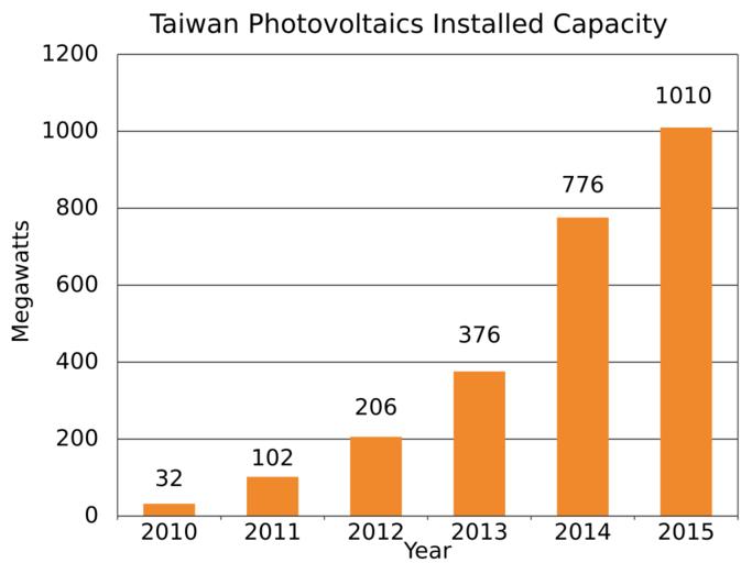 | Keywords: Taiwan Photovoltaics Installed Capacity.svg translate yes en Installed photovoltaics in Taiwan from 2010 to 2015 Source http //www iea-pvps org/fileadmin/dam/public/report/PICS/IEA-PVPS_-__A_Snapshot_of_Global_PV_-_1992-2015_-_Final_2_02 pdf IEA-PVPS 2016-05-03 own Delphi234 other versions cc-zero Solar energy in Taiwan Photovoltaic power statistics |