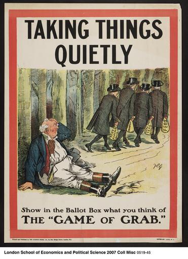 | Keywords: COLL MISC 0519-045 Small poster showing John Bull resting against a tree in a wood, having been assaulted and robbed by unidentified men dressed in black frock coats and top hats. The men are carrying bags called Rent of Teachers House, Endowment, Wear and Tear Repairs, and Fees. Conservative and Unionist poster.  COLL MISC 0519-045 Small poster showing John Bull resting against a tree in a wood, having been assaulted and robbed by unidentified men dressed in black frock coats and top hats. The men are carrying bags called Rent of Teachers House, Endowment, Wear and Tear Repairs, and Fees. Conservative and Unionist poster. |