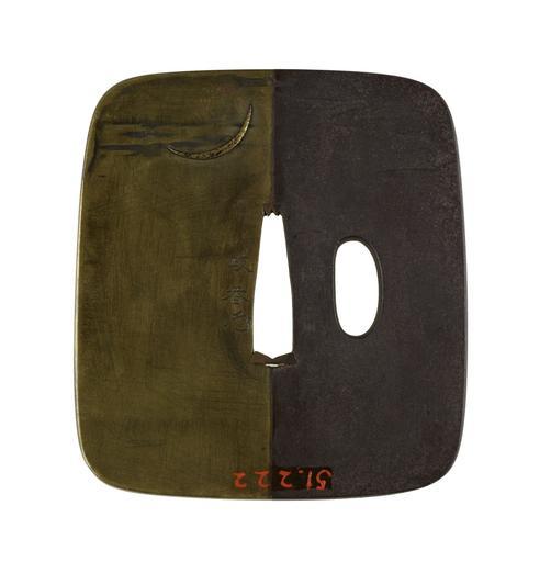 | Keywords: Tamagawa Masaharu - Tsuba with a Temple Guardian Statue - Walters 51222 - Back.jpg The fierce figure on the right of this tsuba is one of the paired guardians ni-ô who guard the main south gate at Buddhist temples in Japan The fierce figures protect temples from evil spirits The dove on the left side of the composition is a symbol of the Shinto deity Hachiman the deified form of the Emperor Ôjin died 310 The gate guardian shown here may be from the Tsurugaoka Hachiman shrine and temple complex in Kamakura Both guardians were transferred to another site in the late 19th century when Buddhist objects were removed from Shinto shrines On the reverse of the tsuba is a crescent moon 1st half Other date century 18 Edo iron sentoku gold silver copper cm 8 9 8 08 0 49 accession number 51 222 27079 Henry Walters Baltimore date and mode of acquisition unknown Walters Art Museum Henry Walters Acquired by Henry Walters Signature Genshosai/Masaharu place of origin Edo present-day Tokyo Japan Walters Art Museum license Tsuba in the Walters Art Museum Media contributed by the Walters Art Museum needs category review Tamagawa Masaharu |