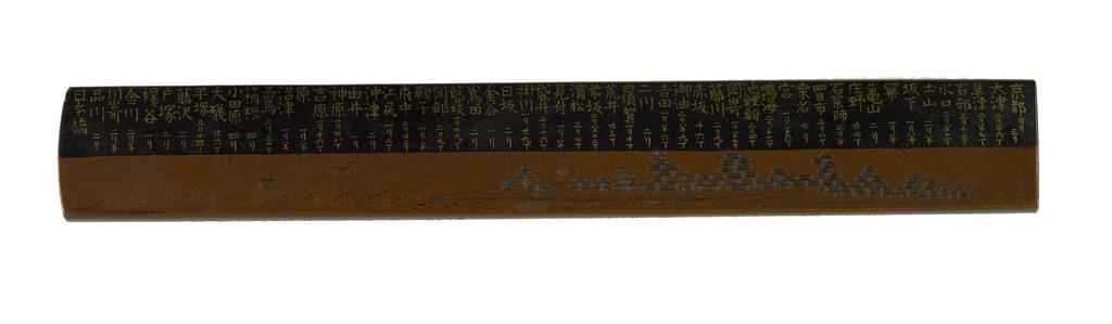 | Keywords: Tani Motosada - Kozuka with Mt Fuji and the 53 Stations of the Tôkaidô - Walters 51644 - Back.jpg A depiction of Mt Fuji fills the front of the kozuka The peak is often covered in snow represented here in silver On the reverse is a list in gold inlay of the fifty-three stations of the Tôkaidô road between Edo now Tokyo and Kyoto Below each station name is the distance to the next station On the bottom half of the reverse side is a landscape scene This may be Amanohashidate in northern Kyoto prefecture The view of the sand bar covered with pines at Amanohashidate is considered one of the three great views in Japan 1841 late Edo shakudo copper silver gold cm 9 9 accession number 51 644 4656 Henry Walters Baltimore date and mode of acquistion unknown Walters Art Museum Henry Walters Acquired by Henry Walters Date iji Tenpô jyû ni nen kanoto ushi chûtô ; Translation 1841 year of the ox 11th month; Signature Unyô Jugakuken Tani Motosada horu kore; Translation Unyô Jugakuken Tani Motosada carved this place of origin Shimane Japan Walters Art Museum license Kozuka in the Walters Art Museum Media contributed by the Walters Art Museum needs category review Tani Motosada |