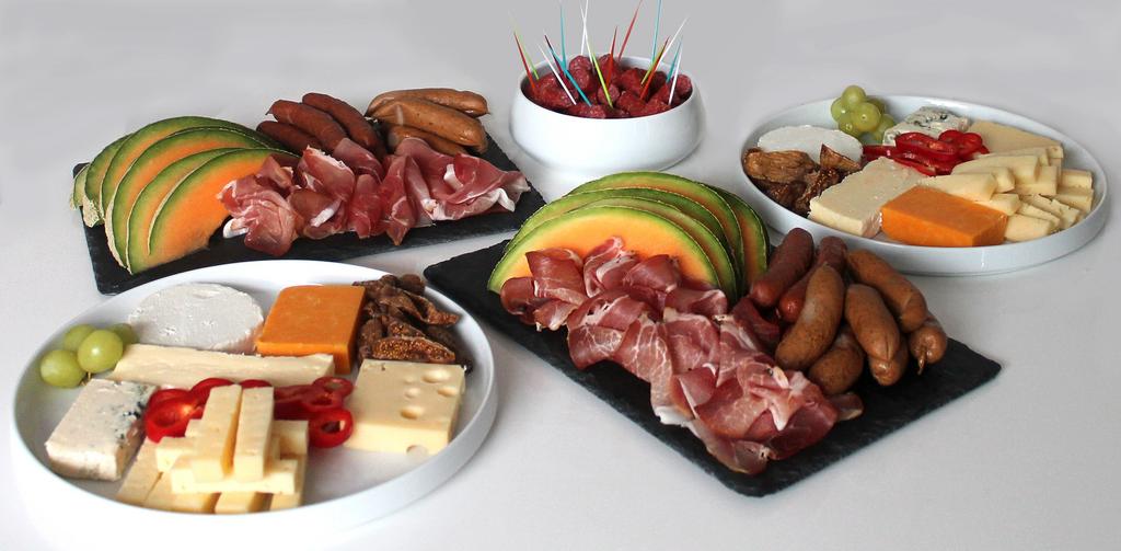 Keywords: tapas refreshments food meat cheese party food plate appetizing ham melon sausages