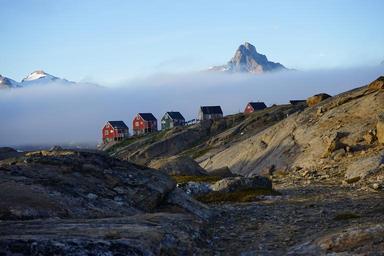 Keywords: tasiilaq greenland east greenland homes cottages landscape fog mountains