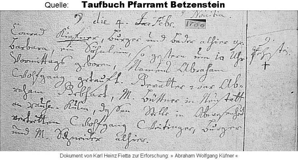 | Keywords: Taufbuch1760Pfarramt Betzenstein+Küfner.jpg de Taufbuch-Eintrag Beschreibung Deutsch Taufbucheintrag des Pfarramts Betzenstein von 1760 4 Februar Conrad Küfner Bürger und Bader alhier Barbara ein Söhnlein so gestern um 10 Uhr vormittags geboren Namens Abraham Wolfgang getauft Gevatter war Ab raham Gebhart M Büttner in Neustatt am rauen Kulm dessen Stelle in Abwesenheit vertretten Wolfgang Weitinger Bürger und M Schneider alhier Anmerkung Gevatter Taufpate Aus dem Text ergibt sich das Geburtsdatum von Abraham Wolfgang Küfner 3 Februar 1760 geboren in Betzenstein own KHFietta 1760-02-03 Pfarramt Betzenstein 1760 Cc-zero Abraham Wolfgang Küfner |