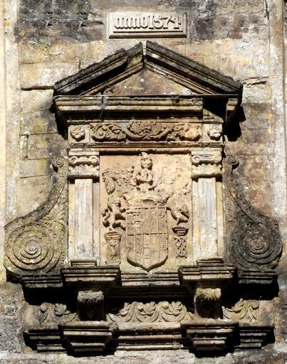 | Keywords: TawstockCourtGatehouseAedicule.JPG heraldic achievement of William Bourchier 3rd Earl of Bath d 1623 The ten quarterings shown on the escutcheon are as follows with tinctures added <ref>The same quarterings are shown on the monument of Lady Frances Bourchier d 1612 in the Bedford Chapel Chenies Buckinghamshire daughter of the 3rd Earl of Bath http //www middlesex-heraldry org uk/publications/monographs/chenies/cheniesBKM-monuments htm</ref> 1 Argent a cross engrailed gules between four water bougets sable Bourchier 2 Gules a fess argent between 15 billets or 5 4 3 2 1 Louvaine across the first two quarters is a label of three points for difference 3 Quarterly per fess indented argent and gules FitzWarin 4 Gules a fret or Audley 5 Argent three aspen leaves erect gules Cogan 6 Sable a chevron barry nebuly argent and gules Hankford 7 Argent two bars wavy sable Stapledon 8 Argent two bars gules each charged with three bezants Martin 9 Gules four fusils in fess ermine Dinham 10 Gules three pairs of arches argent Arches The dexter supporter of a horse or possibly heraldic antelope stands on a pedestal showing a peacock in its pride the crest of George Manners 11th Baron de Ros c 1470-1513 <ref>Debrett's Peerage 1968 p 968</ref> whose daughter Eleanor Manners married after 1524 as his 2nd wife John Bourchier 2nd Earl of Bath 1499-1560/61 The sinister supporter of a dove or falcon stands on a pedestal showing the Bourchier knot <ref>The Manners peacock and Bourchier knot are also shown sculpted with the arms of Bourchier impaling Manners above the south-east door to Tawstock Church</ref> Above the shield is the Bourchier crest A man's head in profile proper ducally crowned or with a pointed cap gules<ref>Visitation of Devon 1895 p 106</ref> References <references/> own photo Lobsterthermidor <span class signature-talk >talk</span> 22 59 19 March 2013 UTC 2013 Tawstock Court Hankford arms Stapledon arms FitzWarin arms Bourchier arms Dinham arms Arches arms Cogan arms Bourchier knot Earls of Bath |