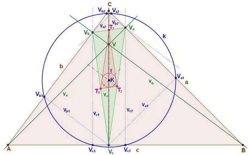 | Keywords: Taylor Circle.JPG en Taylor circle ΔABC a b c sides v<sub>a</sub> v<sub>b</sub> v<sub>c</sub> altitudes V<sub>a</sub> V<sub>b</sub> V<sub>c</sub> feet of the altitudes V orthocenter ΔV<sub>a</sub>V<sub>b</sub>V<sub>c</sub> orthic triangle ΔT<sub>1</sub>T<sub>2</sub>T<sub>3</sub> medial triangle of orthic triangle t incircle of ΔT<sub>1</sub>T<sub>2</sub>T<sub>3</sub> v<sub>a1</sub> v<sub>a2</sub> v<sub>b1</sub> v<sub>b2</sub> v<sub>c1</sub> v<sub>c2</sub> perpendiculars through vertices ΔV<sub>a</sub>V<sub>b</sub>V<sub>c</sub> to remaining sides k Taylor circle K center of k t circles V<sub>a1</sub> V<sub>a2</sub> V<sub>b1</sub> V<sub>b2</sub> V<sub>c1</sub> V<sub>c2</sub> intersections of perpendiculars v<sub>a1</sub> v<sub>a2</sub> v<sub>b1</sub> v<sub>b2</sub> v<sub>c1</sub> v<sub>c2</sub> and sides a b c all points lie at Taylor circle cs Taylorova kružnice ΔABC a b c strany v<sub>a</sub> v<sub>b</sub> v<sub>c</sub> výšky V<sub>a</sub> V<sub>b</sub> V<sub>c</sub> paty výšek V ortocentrum průsečík výšek ΔV<sub>a</sub>V<sub>b</sub>V<sub>c</sub> ortický trojúhelník ΔT<sub>1</sub>T<sub>2</sub>T<sub>3</sub> příčkový trojúhelník ortického trojúhelníka t kružnice vepsaná ΔT<sub>1</sub>T<sub>2</sub>T<sub>3</sub> v<sub>a1</sub> v<sub>a2</sub> v<sub>b1</sub> v<sub>b2</sub> v<sub>c1</sub> v<sub>c2</sub> kolmice na strany a b c spuštěné z vrcholů ΔV<sub>a</sub>V<sub>b</sub>V<sub>c</sub> k Taylorova kružnice K střed kružnic k t V<sub>a1</sub> V<sub>a2</sub> V<sub>b1</sub> V<sub>b2</sub> V<sub>c1</sub> V<sub>c2</sub> průsečíky kolmic v<sub>a1</sub> v<sub>a2</sub> v<sub>b1</sub> v<sub>b2</sub> v<sub>c1</sub> v<sub>c2</sub> a stran a b c všechny leží na Taylorově kružnici own Lukas Sova 2009-03-23 math Taylor circle |
